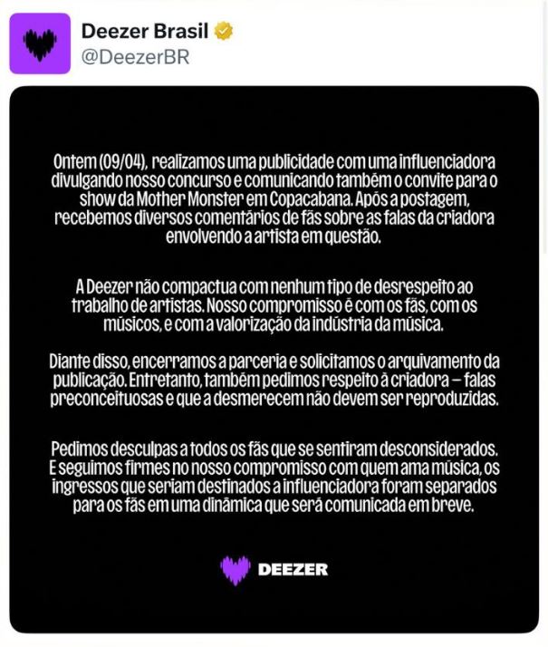 “A Deezer não compactua com nenhum tipo de desrespeito ao trabalho de artistas. Nosso compromisso é com os fãs, com os músicos, e com a valorização da indústria da música. Diante disso, encerramos a parceria e solicitamos o arquivamento da publicação”, informou a plataforma.