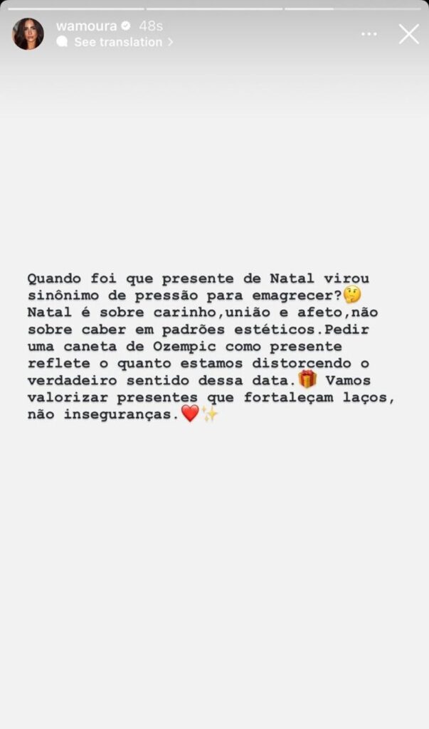 “Gente, quando foi que um presente de Natal virou sinônimo de pressão para emagrecer?”, questionou Wanessa. “O Natal sempre foi sobre carinho, união e afeto. Pedir uma caneta de Ozempic de presente só mostra o quanto estamos distorcendo o sentido das coisas.”
