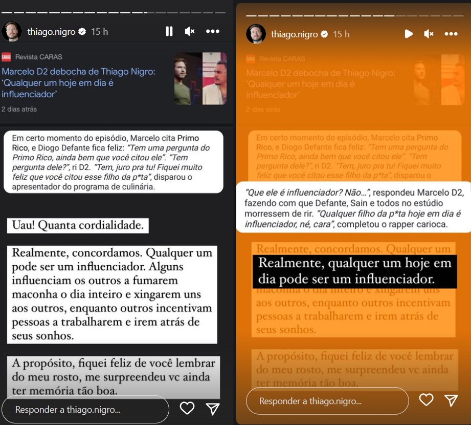 Uma frase polêmica compartilhada pelo empresário levou ao comentário carregado de deboche. D2 reagiu após o apresentador Diogo Defante questionar se o músico concorda com uma frase compartilhada por Nigro nas redes sociais: