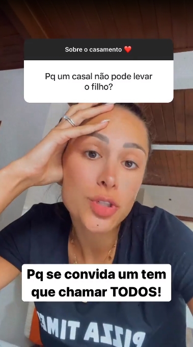 Ela respondeu: “Gente… se eu for convidar os filhos de todos os casais que tô convidando pro meu casamento… eu não tenho condições, não dá! É muita criança na minha família, tem muita criança na família do Lucas. Então não dá, entendeu?