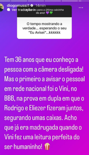 “Tem 36 anos que eu conheço a pessoa com a câmera desligada! Mas o primeiro a avisar o pessoal em rede nacional foi o Vini, no BBB, na prova em dupla em que o Rodrigo e Eliezer fizeram juntos, segurando umas caixas. Acho que já era madrugada quando o Vini fez uma leitura perfeita do ser humaninho!“, declarou Diogo.