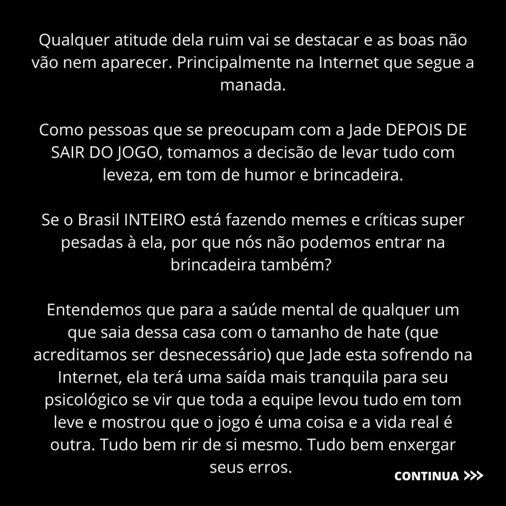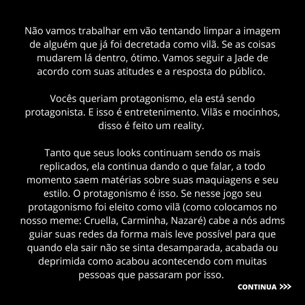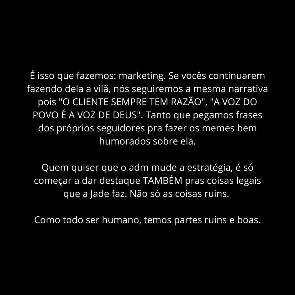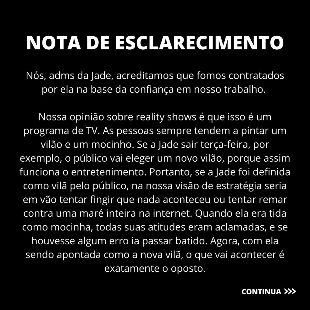 “Nós, adms da Jade, acreditamos que fomos contratados por ela na base da confiança no nosso trabalho. (…) Se a Jade foi definida como vilã pelo público, na nossa visão de estratégia seria em vão tentar fingir que nada aconteceu ou tentar remar contra uma maré inteira na internet”, começaram a nota.