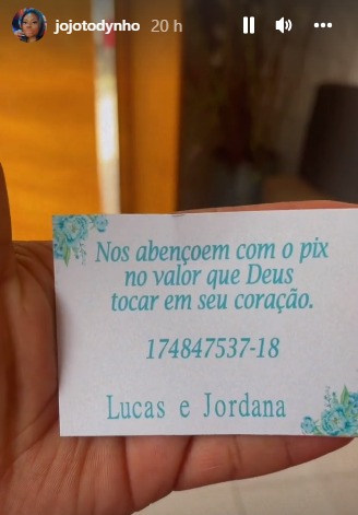 “Ao invés de criticar, aqui ó [Jojo mostra um papel com o número do pix], nos abençoe com um pix. Eu vou ficar imensamente grata a vocês pelo carinho. É o valor que Deus tocar no seu coração”, disse Todynho. A artista ainda chamou os fãs e citou algumas empresas famosas para fazerem a transferência.