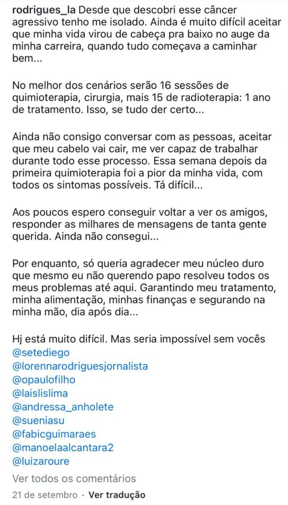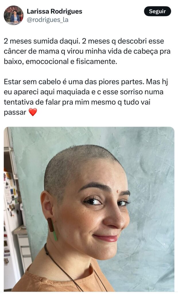 Amigas, estou completamente devastada com esse desabafo fortíssimo da jornalista Larissa Rodrigues sobre o seu diagnóstico de câncer de mama.