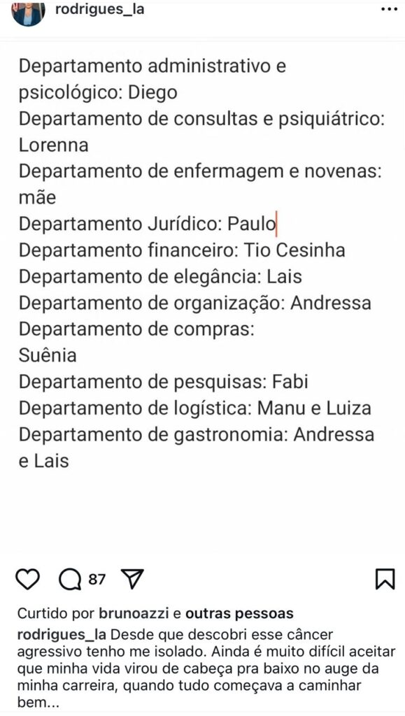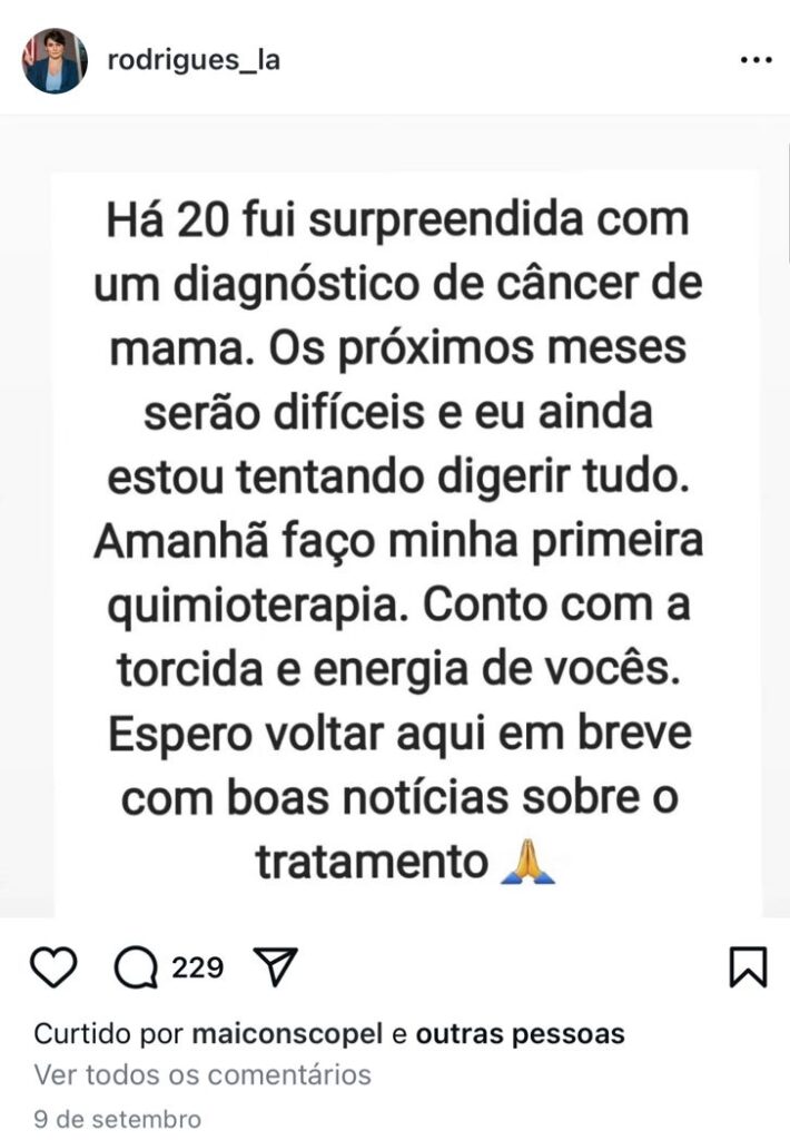 Mas, em seu Instagram, Larissa fez uma publicação no início de setembro contando que há 20 dias, ela foi completamente surpreendida ao saber que estava com câncer de mama e queria iria iniciar sua quimioterapia no dia seguinte, pediu muita energia positiva dos seguidores e disse que voltar com boas notícias do tratamento o mais breve possível.