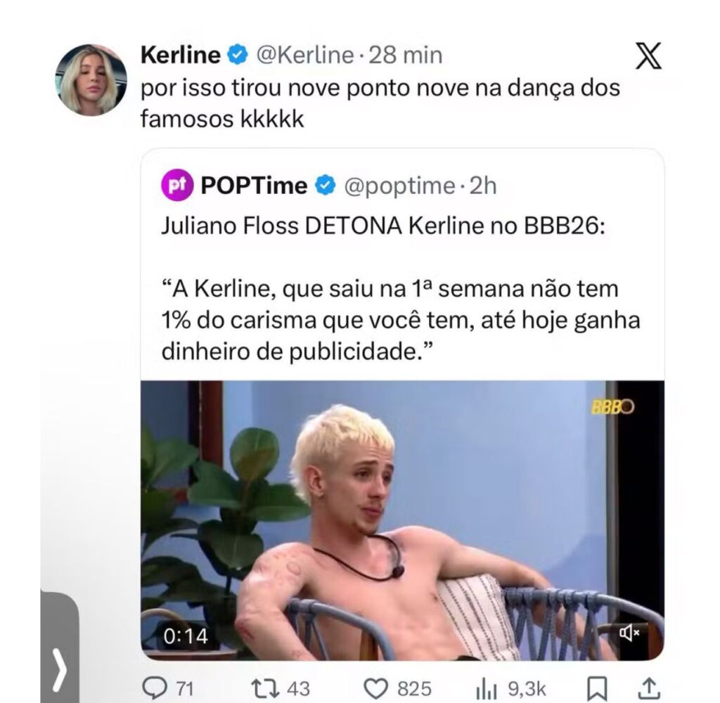 Pois bem. Kerline não engoliu seco e respondeu do jeito que sabe, com ironia afiada e sorriso de quem já entendeu o jogo fora da casa. Nas redes, soltou a frase que virou manchete e meme. Disse que, por isso mesmo, tirou 9,9 na Dança dos Famosos. Risos incluídos. Mic drop digital.