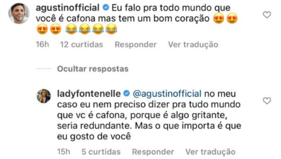 “Me divirto com as pessoas que saem por aí me definindo. Perdão mas vocês não são capazes”, escreveu Fontenelle em sua publicação. Logo em seguida a publicação trazia o comentário de Agustin: “Eu falo pra todo mundo que você é cafona mas tem um bom coração”.