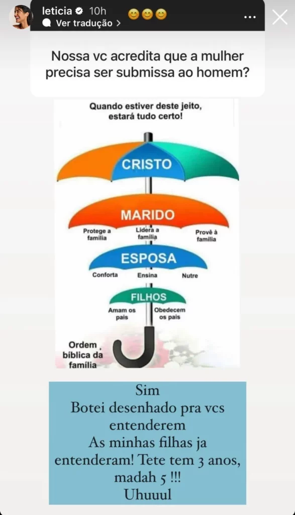 Ao ser questionada sobre o que ela acredita ser a estrutura familiar correta, Leticia publicou um infográfico que deixa claro que na sua visão a mulher deve ser submissa ao homem e afirma que as suas filhas já sabem como as coisas devem ser.