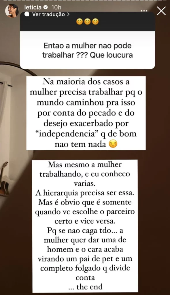 “Na maioria dos casos, a mulher precisa trabalhar porque o mundo caminhou para isso por conta do pecado e do desejo exacerbado por ‘independência’, que de bom não tem nada”, iniciou Letícia.