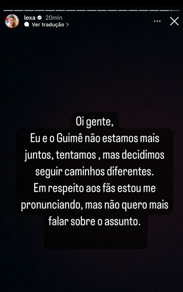 “Oi gente, eu e o Guimê não estamos mais juntos, tentamos, mas decidimos seguir caminhos diferentes. Em respeito aos fãs estou me pronunciando, mas não quero mais falar sobre o assunto”, notificou Lexa.