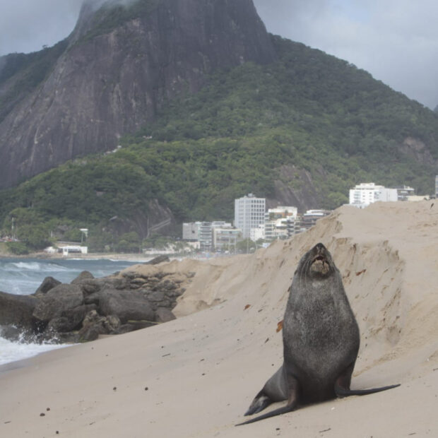 Genteee, estou tomando um cafezinho aqui em Ipanema com a minha amiga do Cosme Velho, quando ouço alguém comentando que tem um lobo-marinho na praia.