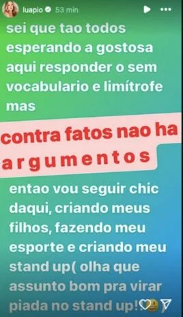“Sei que estão todos esperando a gostosa aqui responder o sem vocabulário e limítrofe, mas contra fatos não há argumentos “, escreveu.