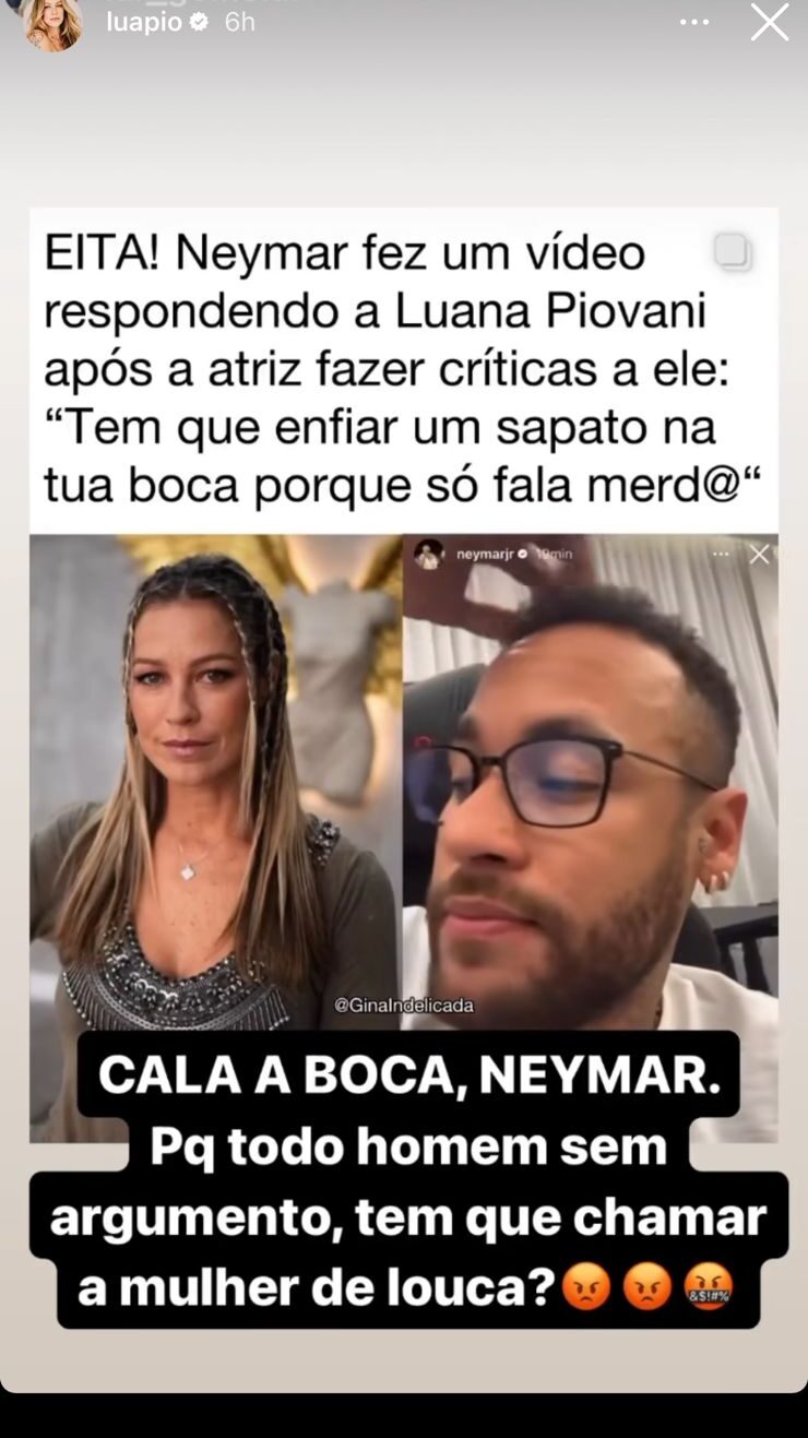 Luana ainda repostou várias publicações de internautas que estão a seu favor na briga com o jogador. “Cala a boca , Neymar, por que todo sem argumento tem que chamar a mulher de louca?“, dizia um post nos seus stories.