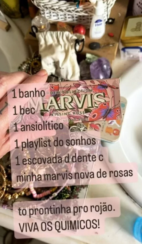 “Um banho, um bec [cigarro de maconha], um ansiolítico, uma playlist dos sonhos, uma escovada de dente com a minha pasta de rosas. Tô prontinha para o rojão, viva os químicos”, revelou Piovani.