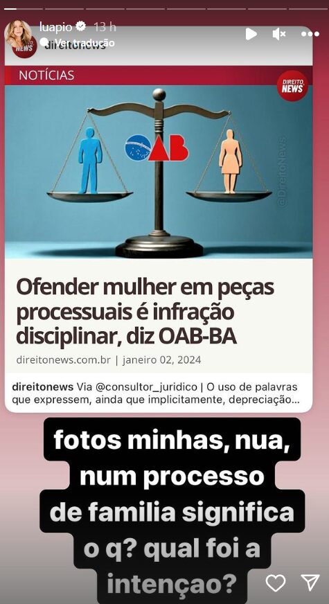 Piovani compartilhou a seguinte manchete nos stories de seu perfil no instagram: “Ofender mulher em peças processuais é infração disciplinar’. Na legenda, a artista logo comentou: ‘Fotos minhas, nua, num processo de família significa o quê? Qual foi a intenção?’”