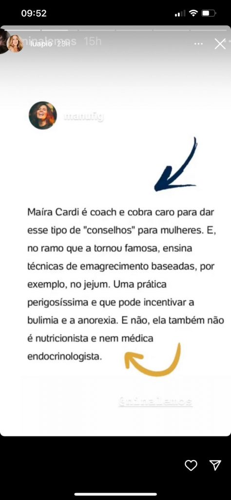 Luana Piovani postou nos seus stories a declaração da nutricionista Manu Figueiredo que dizia que a coach “não é nutricionista, nem médica endocrinologista”, fazendo relação com as técnicas perigosas de emagrecimento que Cardi usa em seus pacientes baseada no jejum.