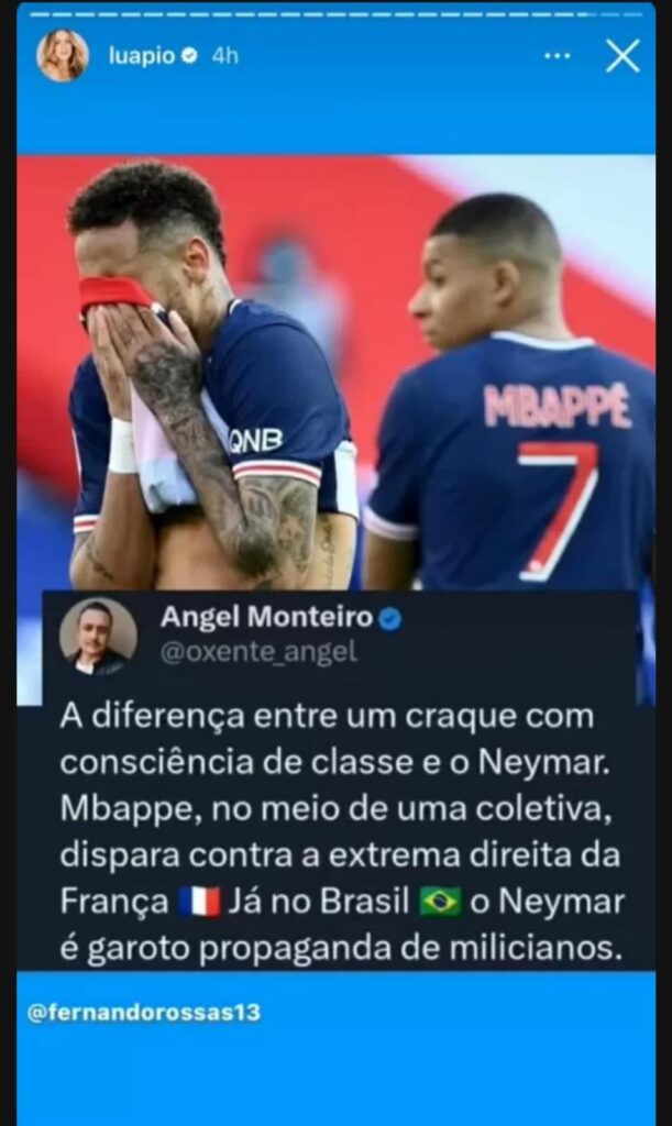 “A diferença entre um craque com consciência de classe e Neymar. Mbappé, no meio de uma coletiva, dispara contra a extremidade direita da França. Já no Brasil, Neymar é garoto propaganda de milicianos.”, diz a publicação compartilhada pela atriz.