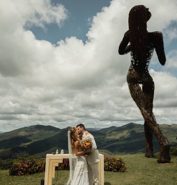 A cena foi de cinema, beijo no altar com montanha de fundo e uma estátua colosso olhando tudo com cara de quem já viu outros amores e segue julgando em silêncio. Cem convidados, nem um a mais, porque intimista hoje é status. A vibe era conexão real, presença verdadeira e aquela coisa toda que a gente diz enquanto checa stories escondida atrás do guardanapo.