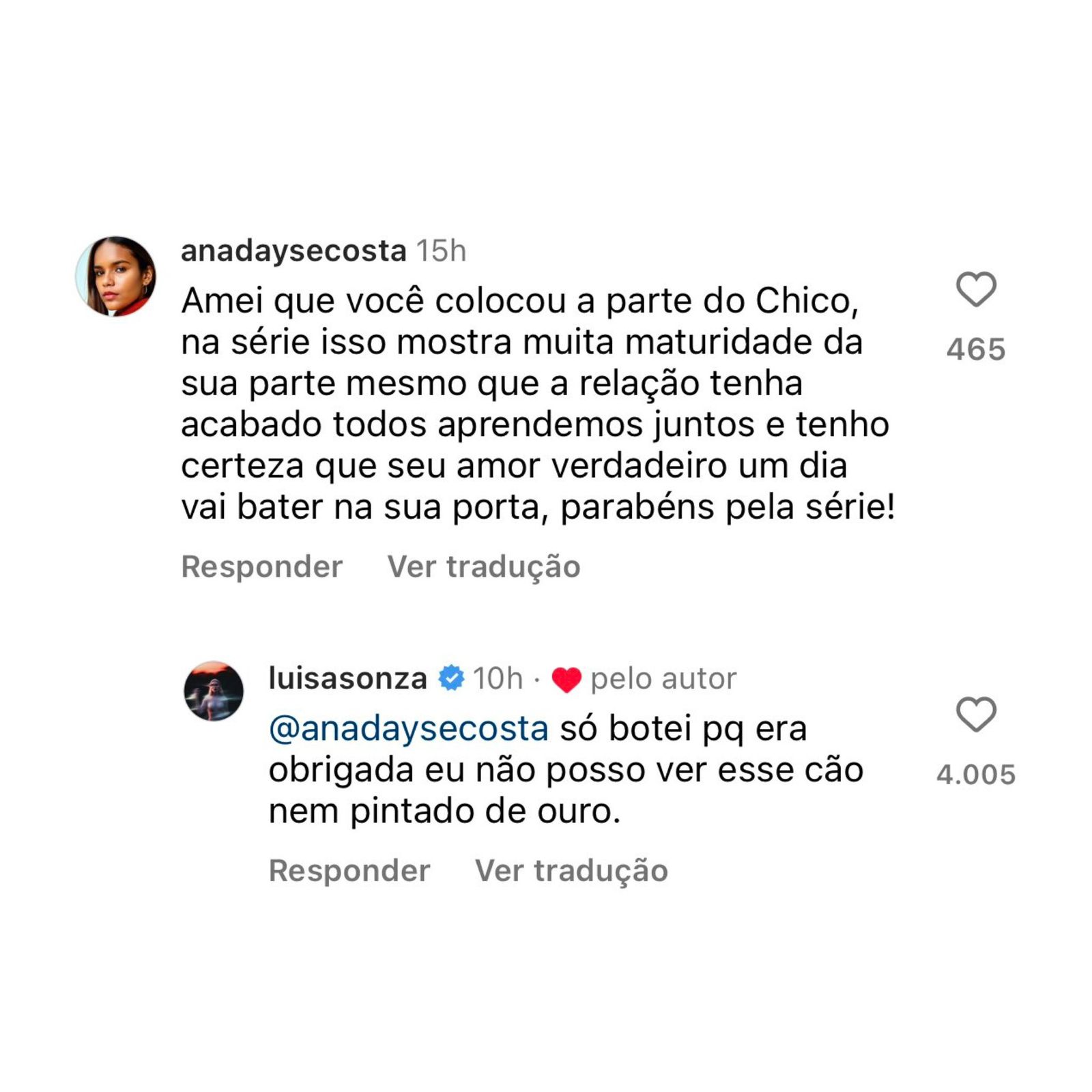 Mas o que mais me surpreendeu foi ver Luísa rebatendo um comentário de fã enaltecendo sua maturidade ao falar do ex-namorado, Chico Moedas. Obviamente, ao ver o comentário, a loira não deixou barato e abriu o jogo sobre o que sente pelo ex, revelando ter sido obrigada a manter as cenas. “Só botei porque era obrigada. Eu não posso ver esse cão nem pintado de ouro”, disse.