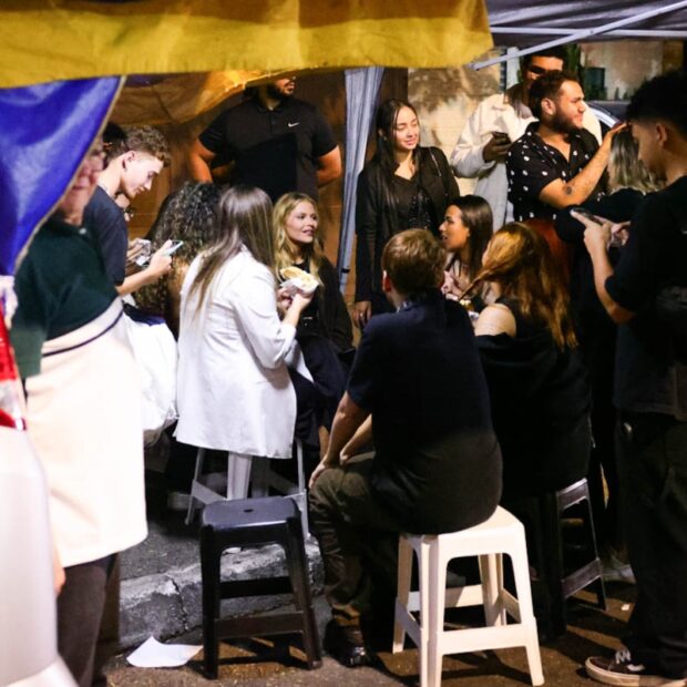 Na ocasião, a gata foi cercada por fãs, que se juntaram à loira e sentaram na calçada da barraquinha de comida.