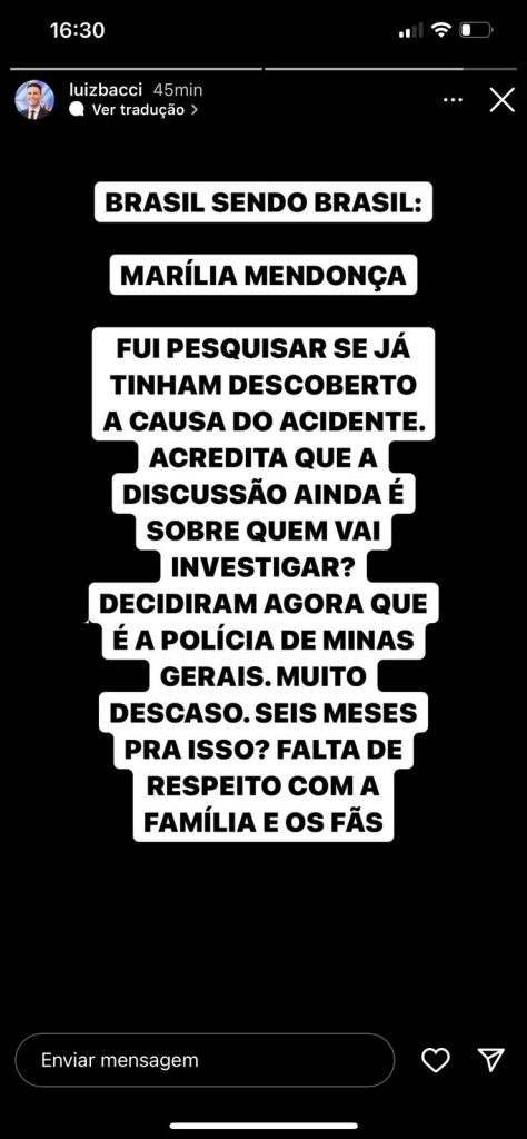 “Brasil sendo Brasil: Marília Mendonça. Fui pesquisar se já tinham descoberto a causa do acidente. Acredita que a discussão é sobre quem vai investigar? Decidiram agora que é a Polícia de Minas Gerais. Muito descaso. Seis meses pra isso? Falta de respeito com a família e os fãs”, escreveu o jornalista.
