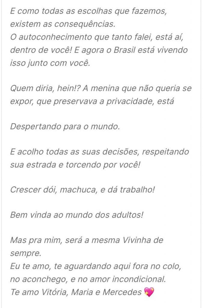 “Mas pra mim, será a mesma Vivinha de sempre. Eu te amo, te aguardando aqui fora no colo, no aconchego, e no amor incondicional. Te amo Vitória, Maria e Mercedes”, finalizou.