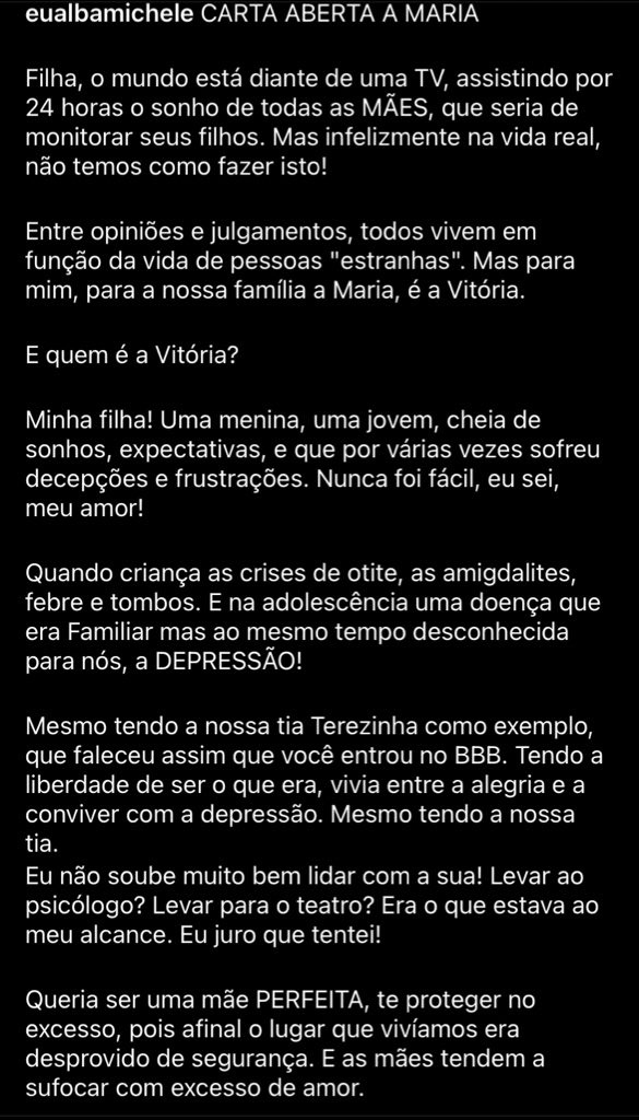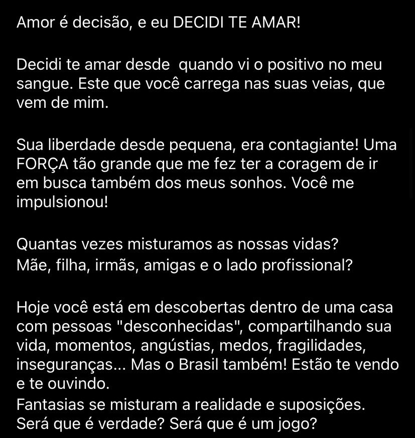 A empresária Alba Michelle, mãe de Maria do ‘BBB22’ postou em seu Instagram (@eualbamichele), uma carta aberta a filha, Vitória — verdadeiro nome de Maria