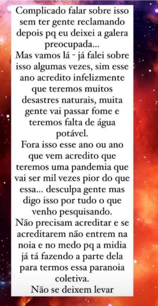 A modelo em sua resposta declarou: “Complicado falar sobre isso sem ter gente reclamando depois porque eu deixei a galera preocupada… Mas vamos lá… já falei sobre isso algumas vezes, sim esse ano acredito que infelizmente teremos muitos desastres naturais, muita gente vai passar fome e teremos falta de água potável. Fora isso, esse ano ou ano que vem acredito que teremos uma pandemia que vai ser mil vezes pior do que essa… desculpa gente digo isso por tudo que venho pesquisando. Não precisam acreditar e se acreditarem não entrem na nóia e no medo porque a mídia já está fazendo o papel dela para termos essa paranoia coletiva. Não se deixem levar…”