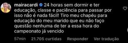 A esposa que tudo vê não aguentou e foi logo defender a postura do marido, que seguiu intacto com as críticas que recebia. “24 horas sem dormir e ter educação, classe e paciência para passar por isso não é nada fácil! Tiro meu chapéu para educação do meu marido”, escreveu.