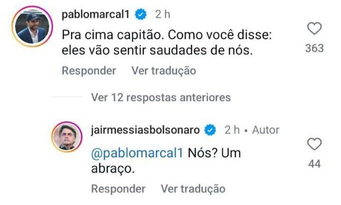 No seu perfil do Instagram, Bolsonaro publicou uma postagem enaltecendo seus supostos avanços de seu governo. Então Marçal, que busca conquistar apoio do campo bolsonarista nas eleições desse ano, comentou: “Para cima deles, capitão. Como você disse: eles vão sentir saudades de nós”.