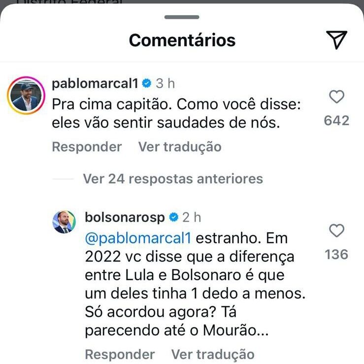 O deputado federal Eduardo Bolsonaro (PL-SP) acabou se envolvendo na discussão: “Estranho. Em 2022 você disse que a diferença entre Lula e Bolsonaro é que um deles tinha um dedo a menos. só acordou agora? Tá parecendo até o Mourão”, atacou o deputado.