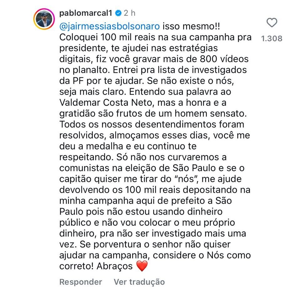 Após essa resposta do ex-presidente, Marçal colocou toda a sua irritação por ter sido excluído do “nós”, já que contribuiu com a doação para a campanha de Bolsonaro. “Todos os nossos desentendimentos foram resolvidos, almoçamos esses dias, você me deu a medalha e eu continuo te respeitando. Só não nos curvaremos a comunistas na eleição de São Paulo e se o o capitão quiser me tirar do ‘nós’, me ajude devolvendo os 100 mil reais depositando na minha campanha aqui de prefeito a São Paulo pois não estou usando dinheiro público e não vou colocar o meu próprio dinheiro, pra não ser investigado mais uma vez. Se porventura o senhor não quiser ajudar na campanha, considere o ‘nós’ como correto! Abraços”, reagiu o empresário.