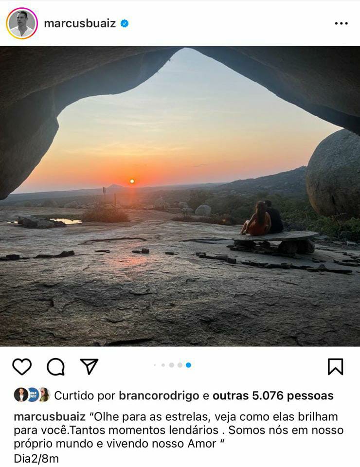 “Olhe para as estrelas, veja como elas brilham para você. Tantos momentos lendários. Somos nós em nosso próprio mundo e vivendo nosso amor. Dia 2/8 meses”, legendou Marcus.