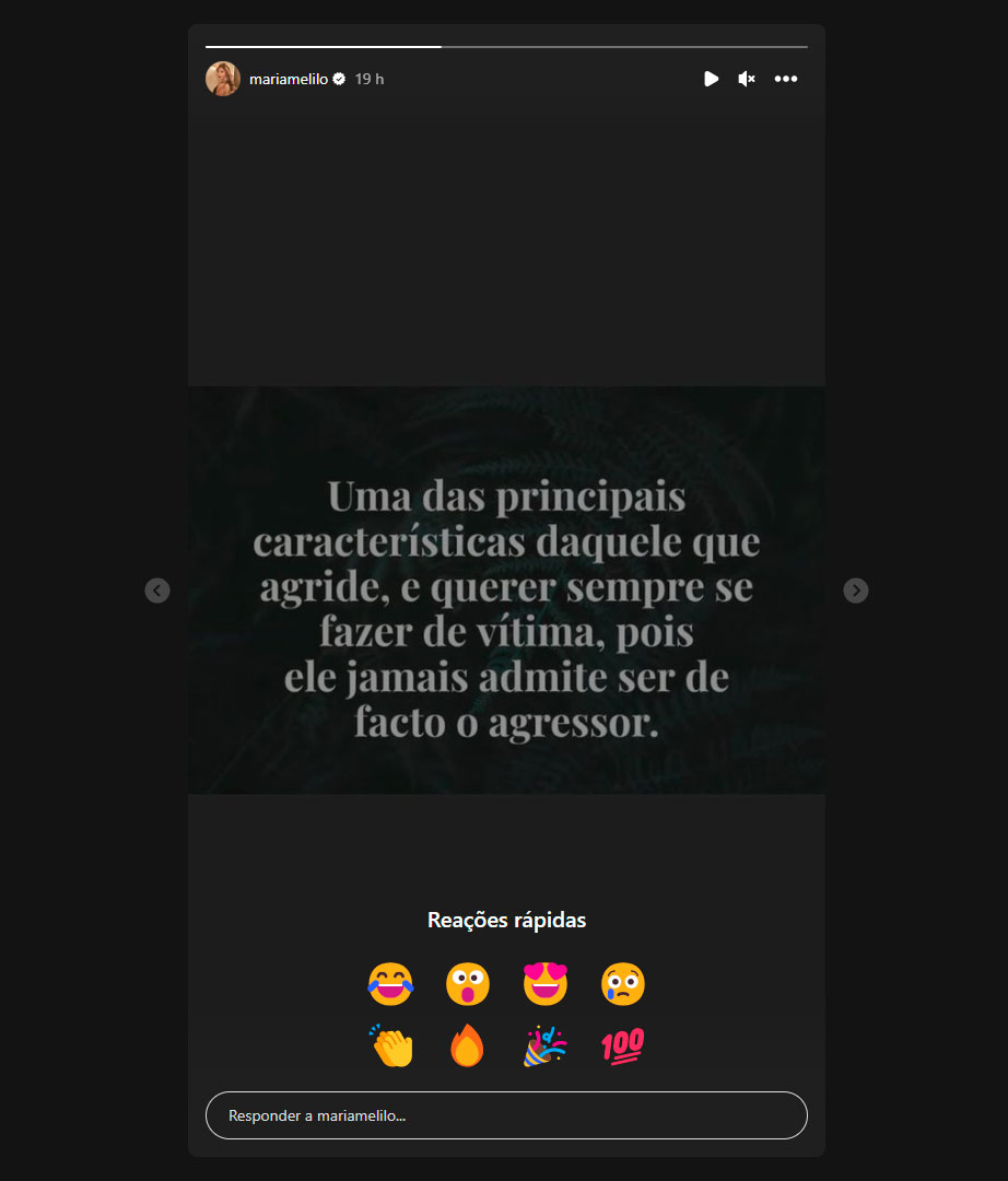 Meus amores, após, na última sexta-feira(19), o humorista Luiz França negar as acusações de agressão que sua namorada, a atriz e campeã do BBB11, Maria Melilo, fez contra ele, ontem (21) ela utilizou os stories do seu instagram para publicar uma indireta bem direta para o comediante.