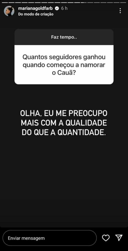 Entre as perguntas que recebeu, a modelo se deparou com uma, que cá entre nós foi feita com a intenção de ser muito mal intencionada. Querendo insinuar que há algum interesse fútil da parte de Mariana, ela foi questionada sobre quantos seguidores havia ganhado desde que assumiu seu relacionamento com o galã das telenovelas brasileiras, Cauã Reymond.