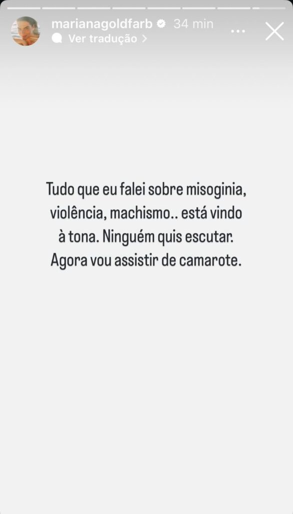 Na publicação, Goldfarb escreveu: “Tudo que eu falei sobre misoginia, violência, machismo… está vindo à tona. Ninguém quis escutar. Agora vou assistir de camarote.”