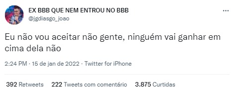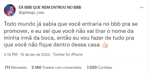 Gente, o rapaz está indignado no Twitter (@jgdiasgo_joao) e começou com “Parabéns Naiara isso eu já sabia, você nunca enganou ninguém”, e em seguida: “Todo mundo já sabia que você entraria no bbb pra se promover, e eu sei que você não vai tirar o nome da minha irmã da boca, então eu vou fazer de tudo pra que você não fique dentro dessa casa”.