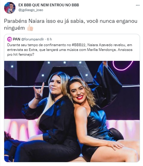 Babado daqueles grandes! BBB mal começou e o irmão da Marilia Mendonça, João Gustavo já está fazendo mutirão para tirar Naiara Azevedo… Motivo? A cantora dos cinquenta reais vai lançar uma música gravada com a saudosa cantora enquanto estiver no reality.