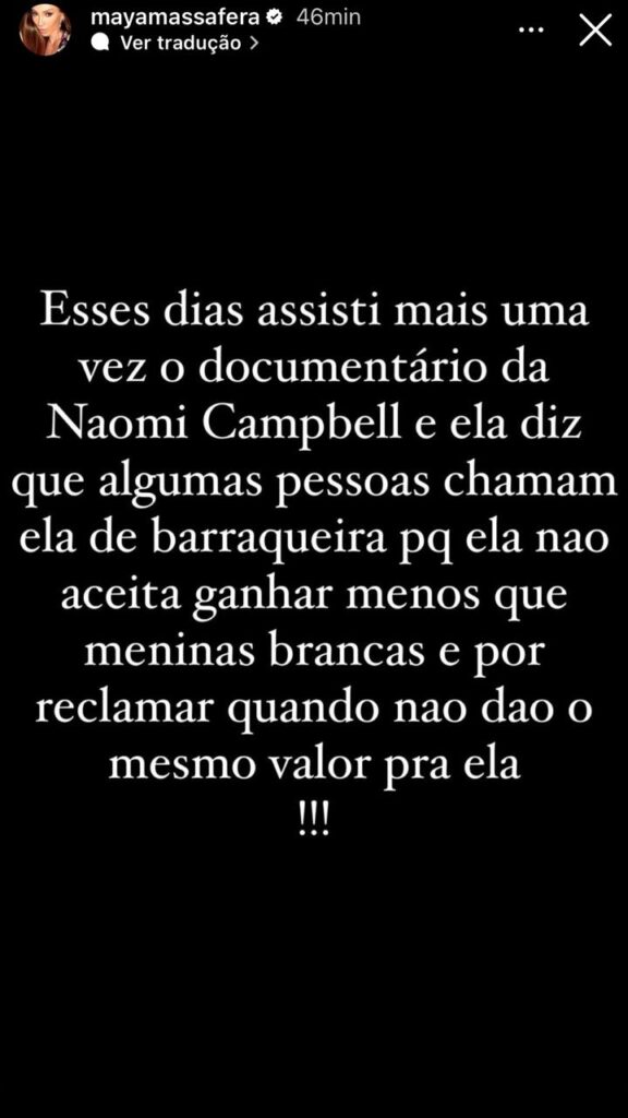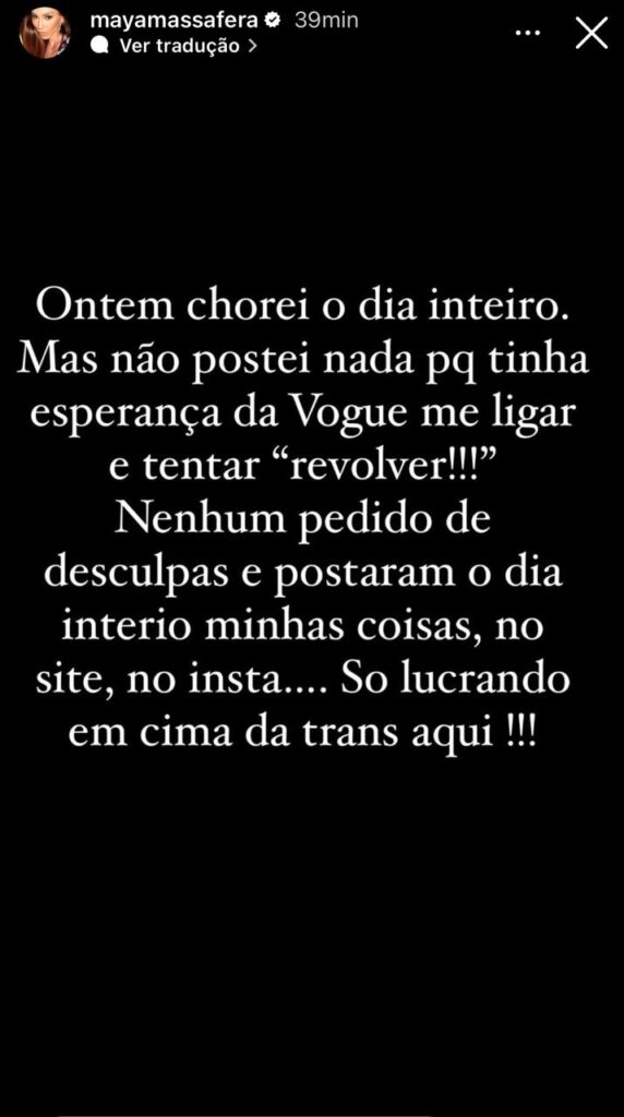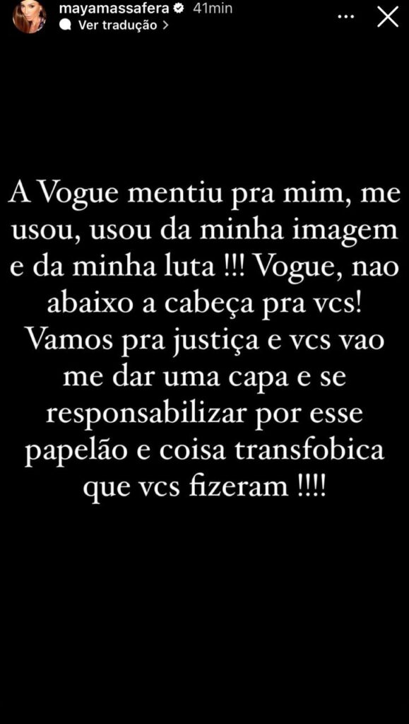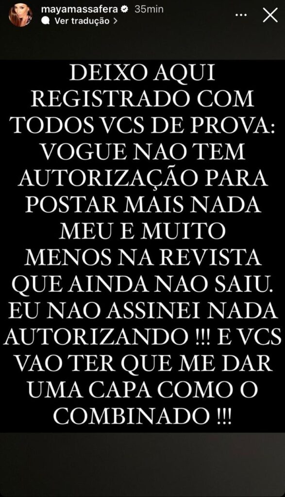 E ainda ressaltou que a revista está proibida de publicar ou mencionar qualquer coisa sobre ela e contou que até o momento, não houve nenhum pedido de desculpas da Vogue sobre o ocorrido.