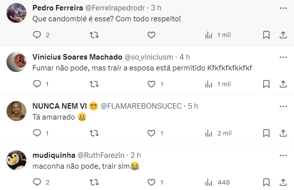 “Não fumo não, só tabaco. Isso é tabaco, não fumo maconha”, respondeu o cantor, que explicou: “Minha religião não permite fumar maconha. Pra quem é do candomblé tá ligado, eu sou filho de Oxóssi”.