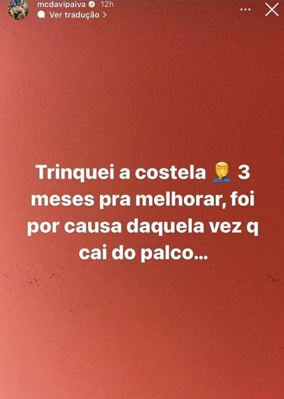 Deu ruim! Davi Paiva, o MC Paiva, contou para os fãs nas redes sociais que trincou 3 costelas depois de cair do palco. O Mc terá que ficar três meses em recuperação, provavelmente sem realizar novos shows. A assessoria do gato ainda não atualizou a imprensa e fãs sobre como vai ficar a agenda do cantor durante esse período.