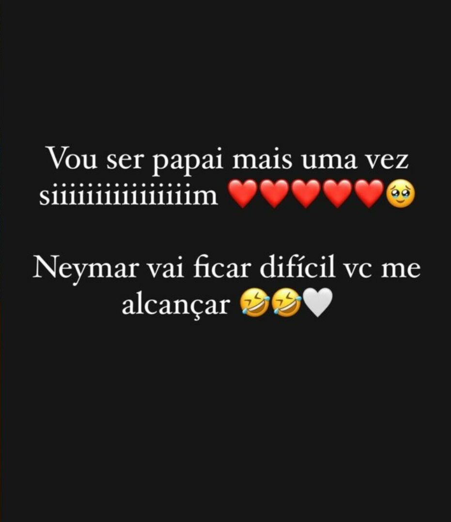 “Vou ser papai mais uma vez sim. Neymar, vai ficar difícil você me alcançar”, brincou Poze nos Stories de seu Instagram.