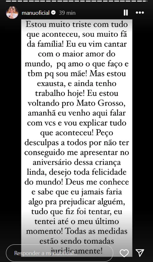 “Peço desculpas a todos por não ter conseguido me apresentar no aniversário dessa criança linda, desejo toda felicidade do mundo! Deus me conhece e sabe que eu jamais faria algo para prejudicar alguém, tudo o que fiz foi tentar, eu tentei até o meu último momento! Todas as medidas estão sendo tomadas juridicamente!, finalizou a artista.
