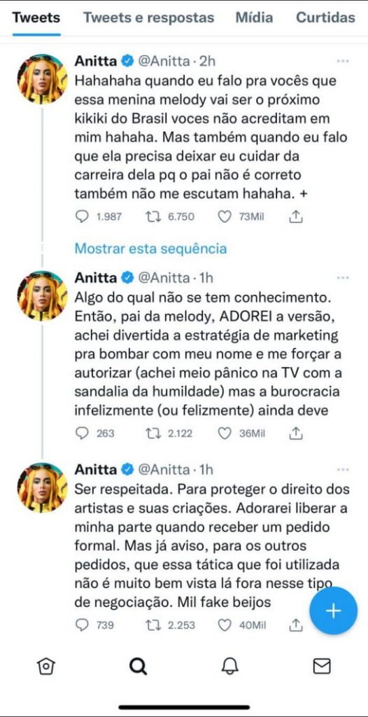 Então Melody seguiu adiante e lançou sua versão, anunciou em seu Instagram e postou a faixa no Youtube. Só que a gravadora de dona Anitta não gostou nada disso e fez o pedido de retirada do vídeo do ar e também de todo o material de divulgação em que tinha a cara da cantora carioca estampada…