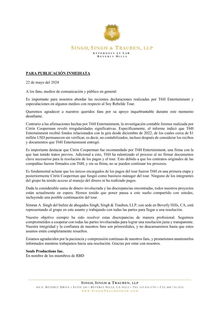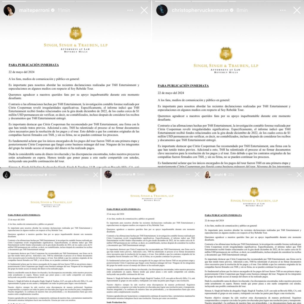 “É importante para nós abordarmos as recentes declarações feitas pela T6H Entertainment e as especulações em algumas mídias sobre a Soy Rebelde Tour”, iniciou a nota enviada à imprensa. “Queremos agradecer aos nossos queridos fãs pelo seu apoio inabalável durante este momento desafiador”.