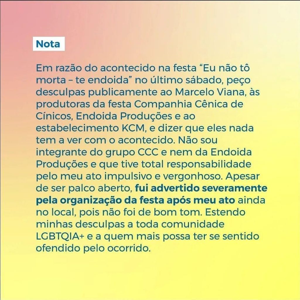 Por outro lado, Wan Aleixo também publicou um pedido de desculpas em seu Facebook.