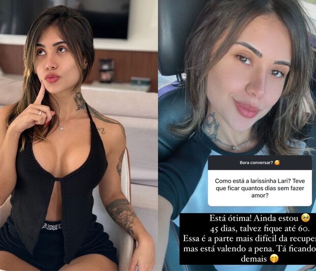 Em suas próprias palavras, Larissa compartilhou com seus fãs os detalhes desse desafio peculiar: “É uma situação complicada, mas necessária para garantir uma recuperação tranquila. Estou seguindo à risca as orientações médicas, mesmo que isso signifique adiar um pouco minha vida sexual”, declara.