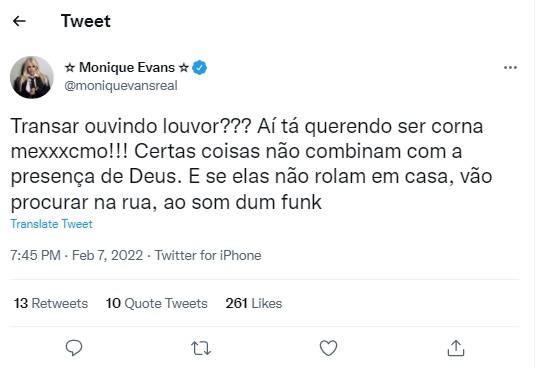 Ela falou: “Transar ouvindo louvor??? Aí tá querendo ser corna mexxxcmo!!! Certas coisas não combinam com a presença de Deus. E se elas não rolam em casa, vão procurar na rua, ao som dum funk.”