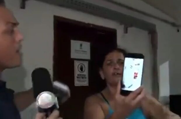 “Ei… Que isso? Você está mostrando essas coisas… O que ela tem a ver com essa história, cuidado que tem criança assistindo”, diz o repórter tentando conter a mulher que se mostra irredutível.
