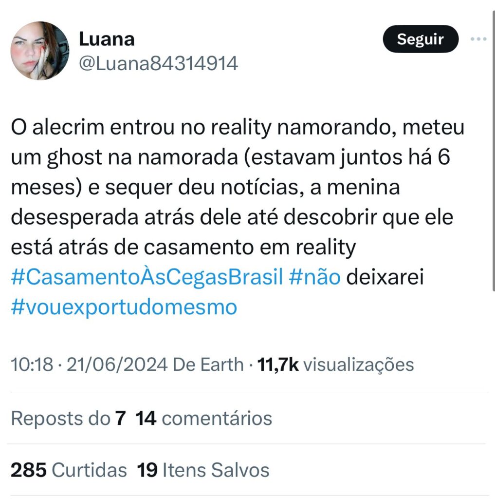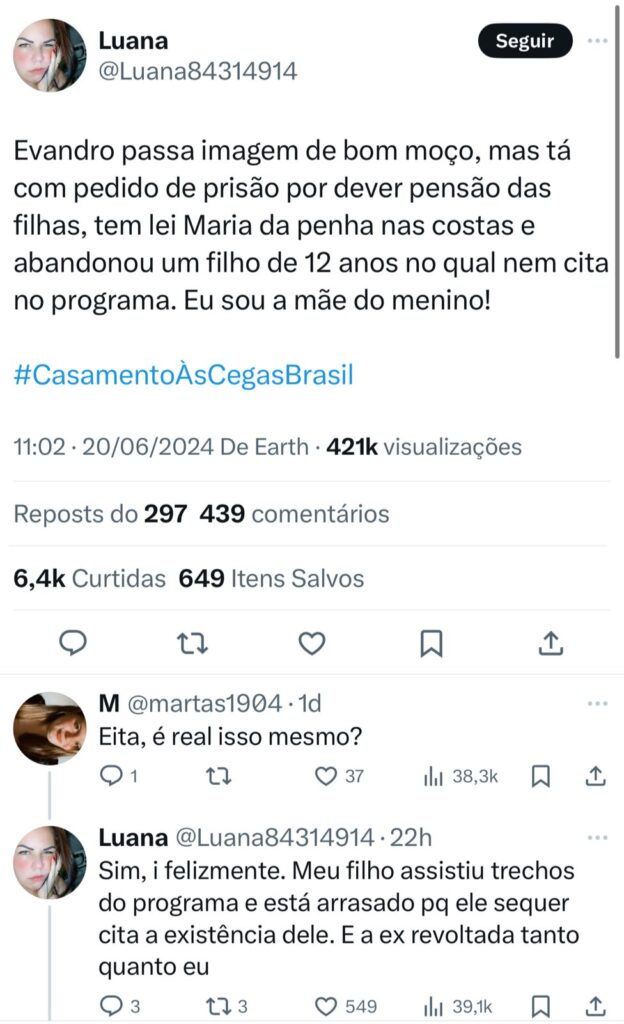 “O alecrim entrou no reality namorando, meteu um ghost na namorada (estavam juntos há 6 meses) e sequer deu notícias. A menina desesperada atrás dele até descobrir que ele está atrás de casamento em reality”, iniciou a mulher, que continuou: “Evandro passa imagem de bom moço, mas está com pedido de prisão por dever pensão das filhas, tem Lei Maria da Penha nas costas e abandonou um filho de 12 anos, o qual nem cita no programa”.